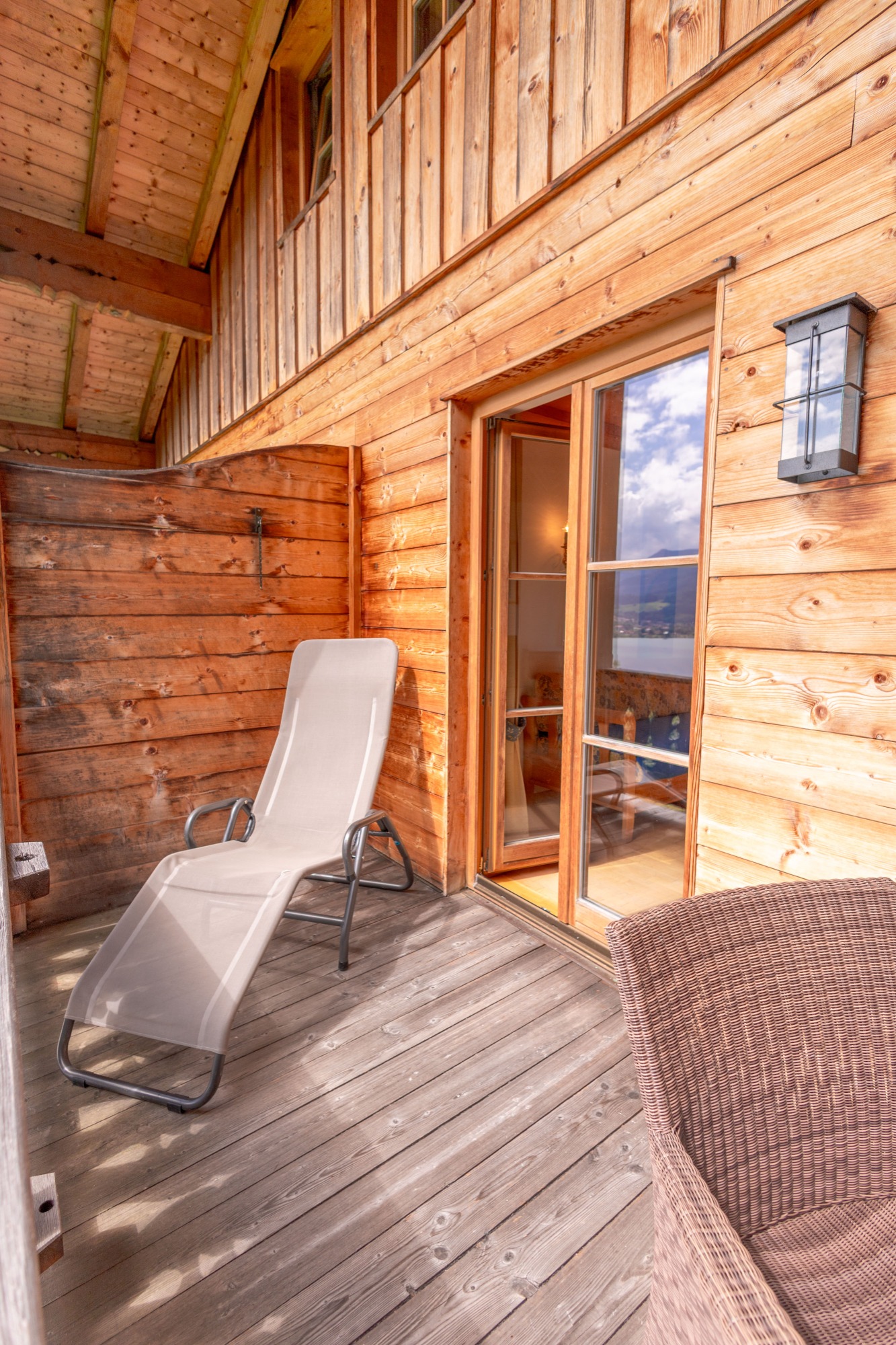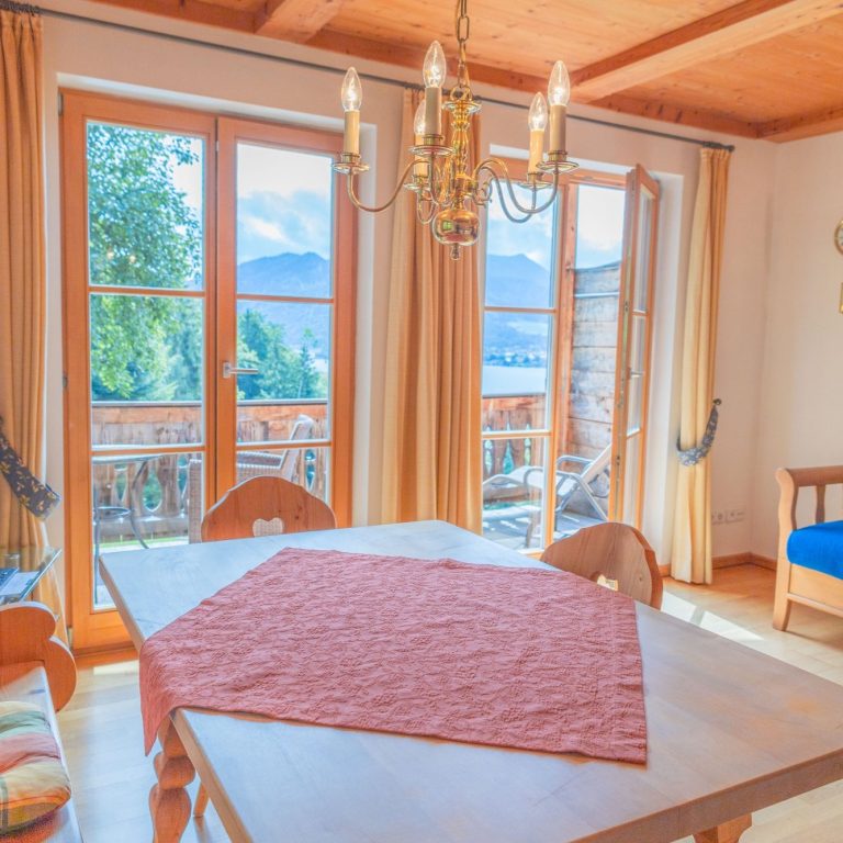 Der helle Wohnbereich, der Balkon auf der Südseite und der Blick Richtung See und Berge schaffen beste Voraussetzungen